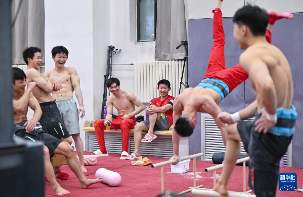 3月14日,队员在体能测试间隙笑着观看队友高天龙(右二)倒立。新华社记者 陶希夷 摄