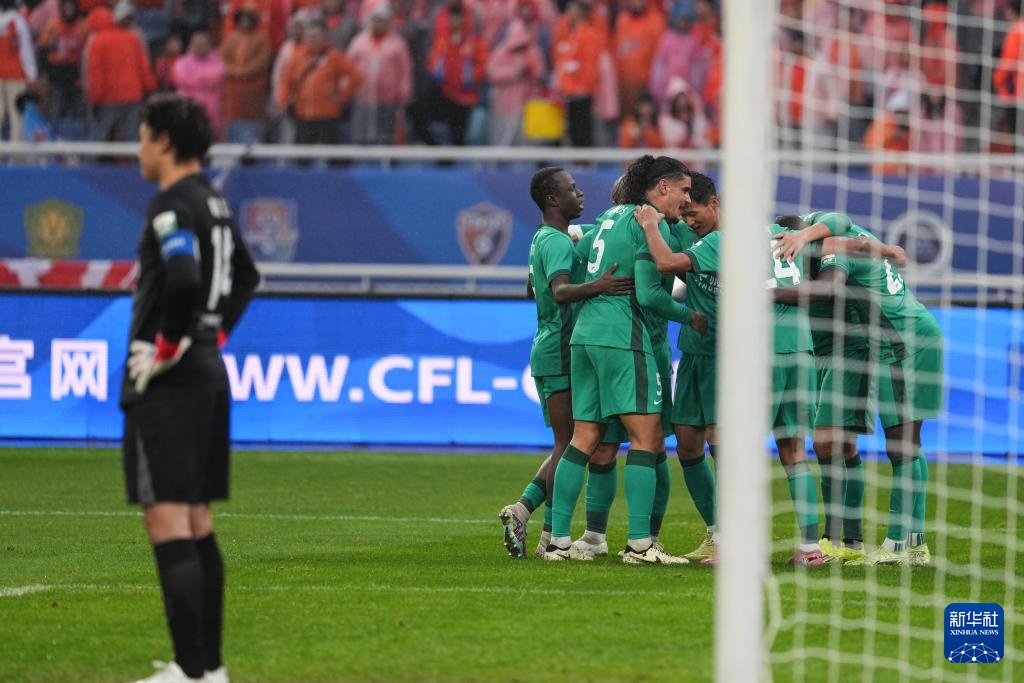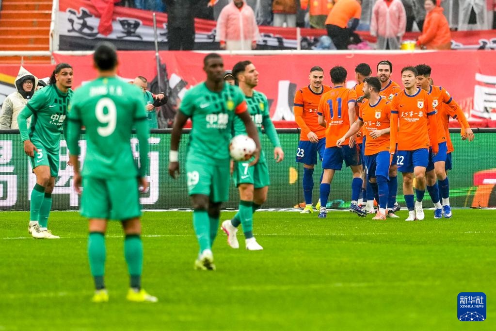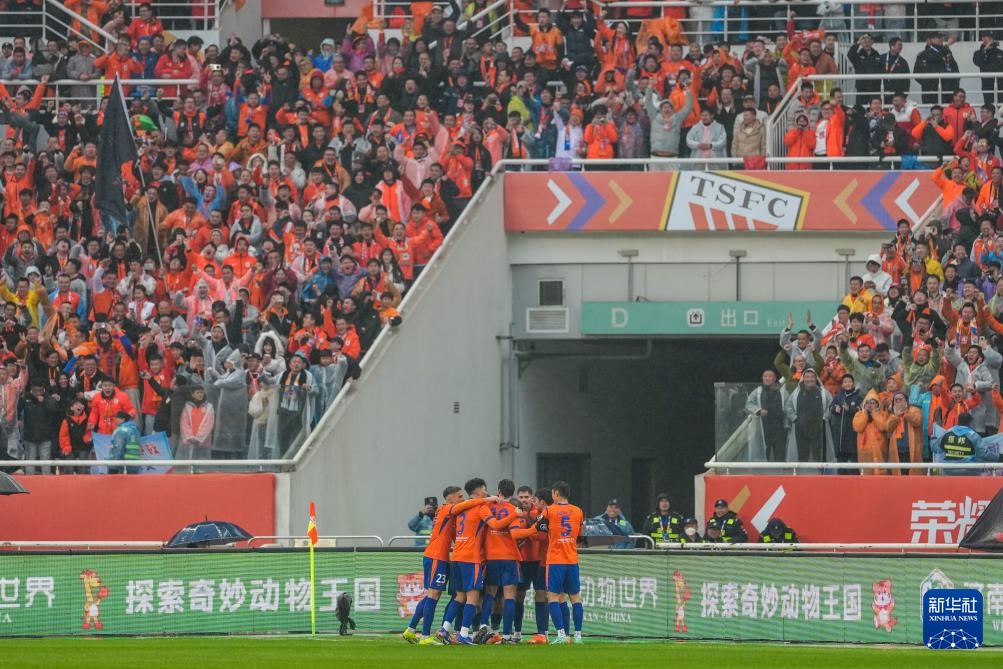 3月14日,山东泰山队球员在比赛中庆祝进球。新华社记者 朱峥 摄