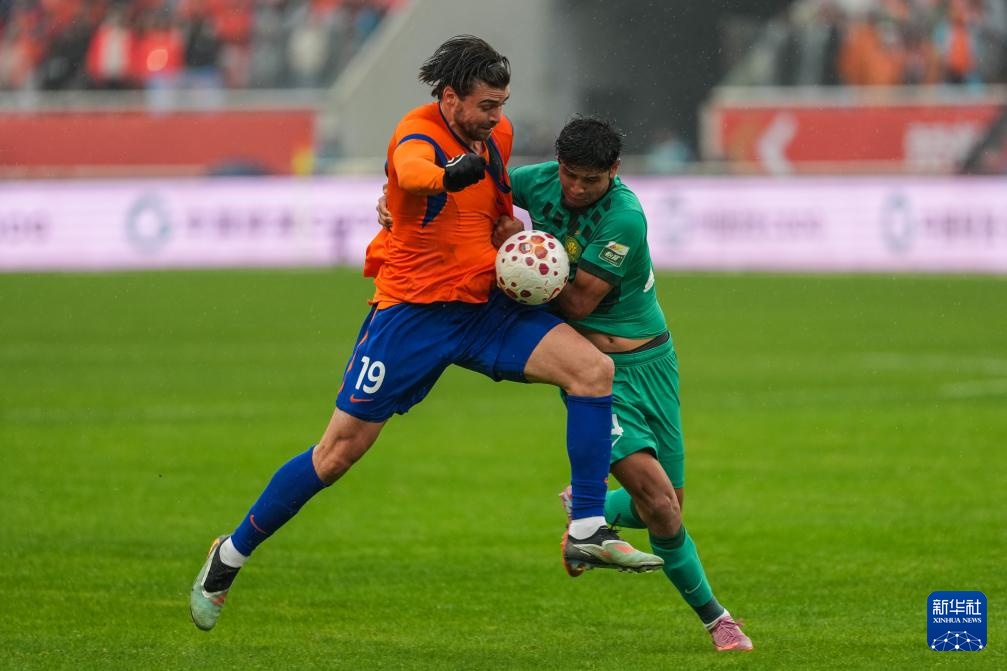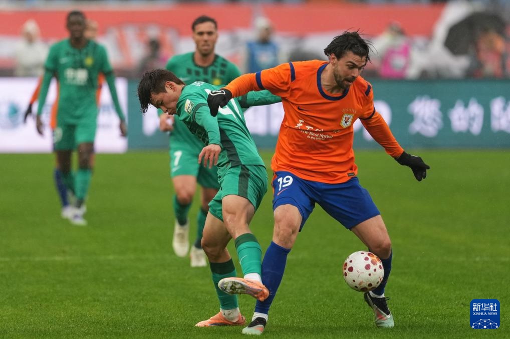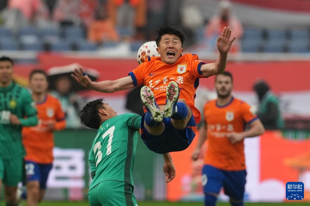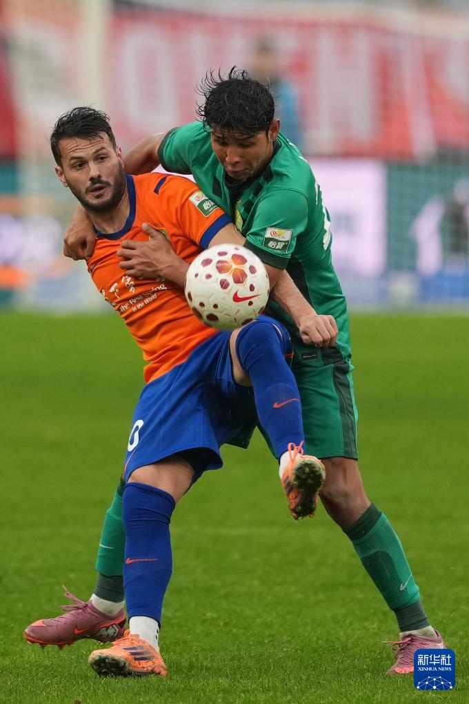 3月14日,山东泰山队球员卡扎伊什维利(左)在比赛中争球。新华社记者 朱峥 摄