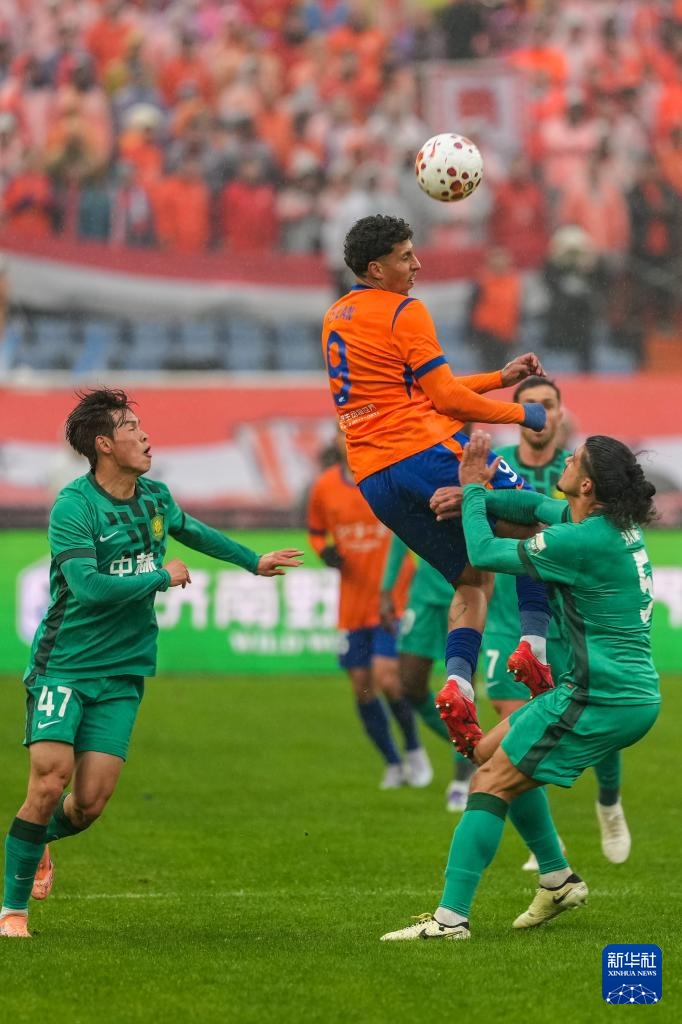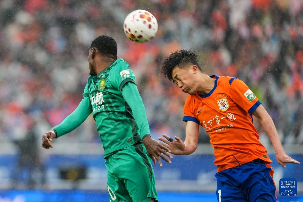 3月14日,山东泰山队球员克雷桑(上)在比赛中争顶。新华社记者 朱峥 摄