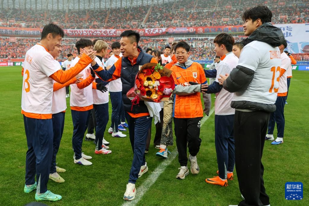 3月14日,山东泰山队球员张弛(中)在赛前参加退役仪式。新华社记者 朱峥 摄