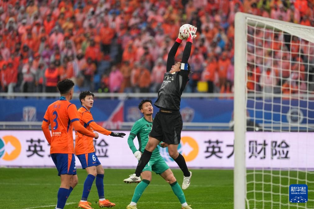 3月14日,山东泰山队守门员王大雷(右)在比赛中扑出对方球员射门。新华社记者 朱峥 摄
